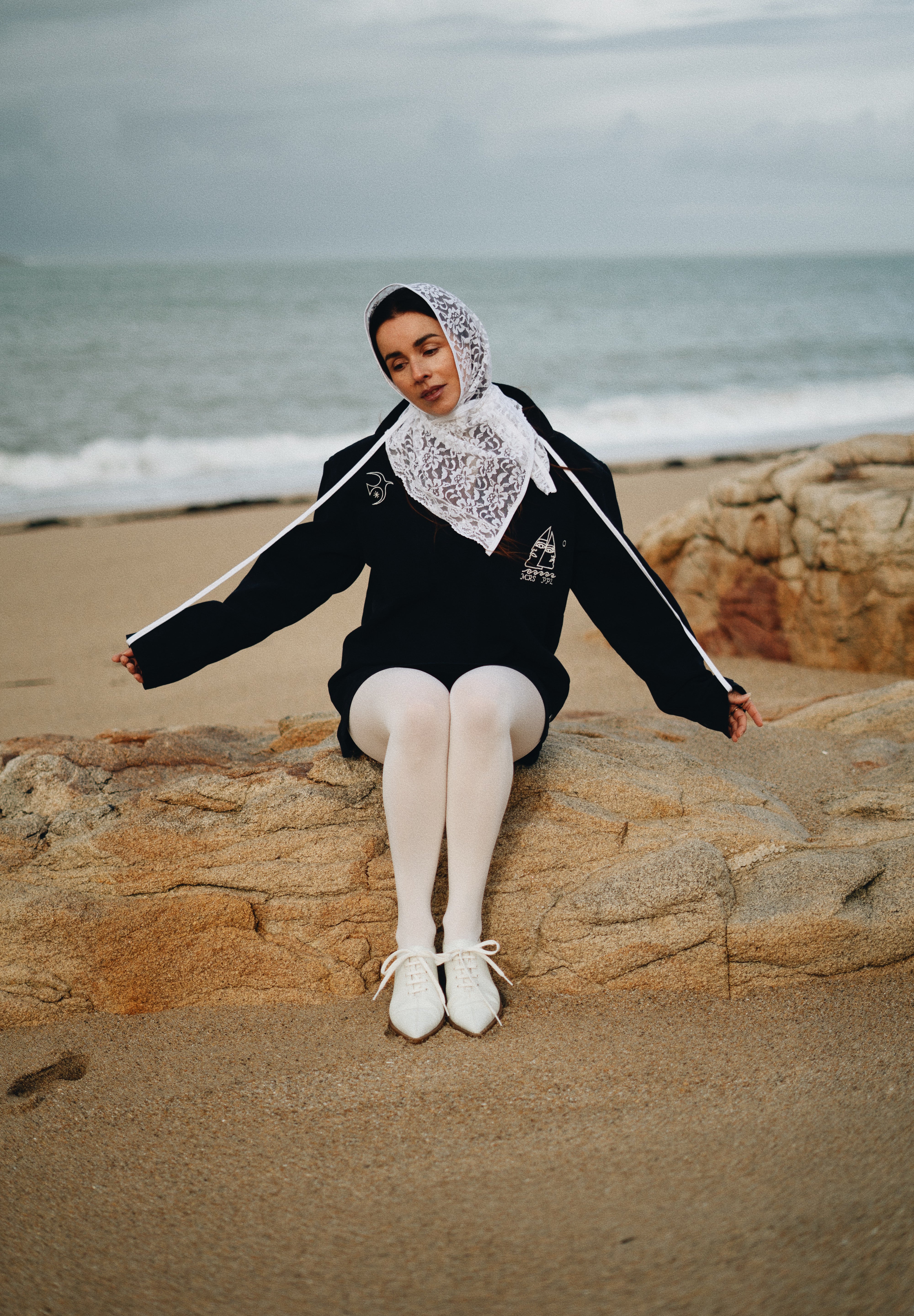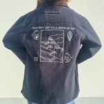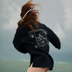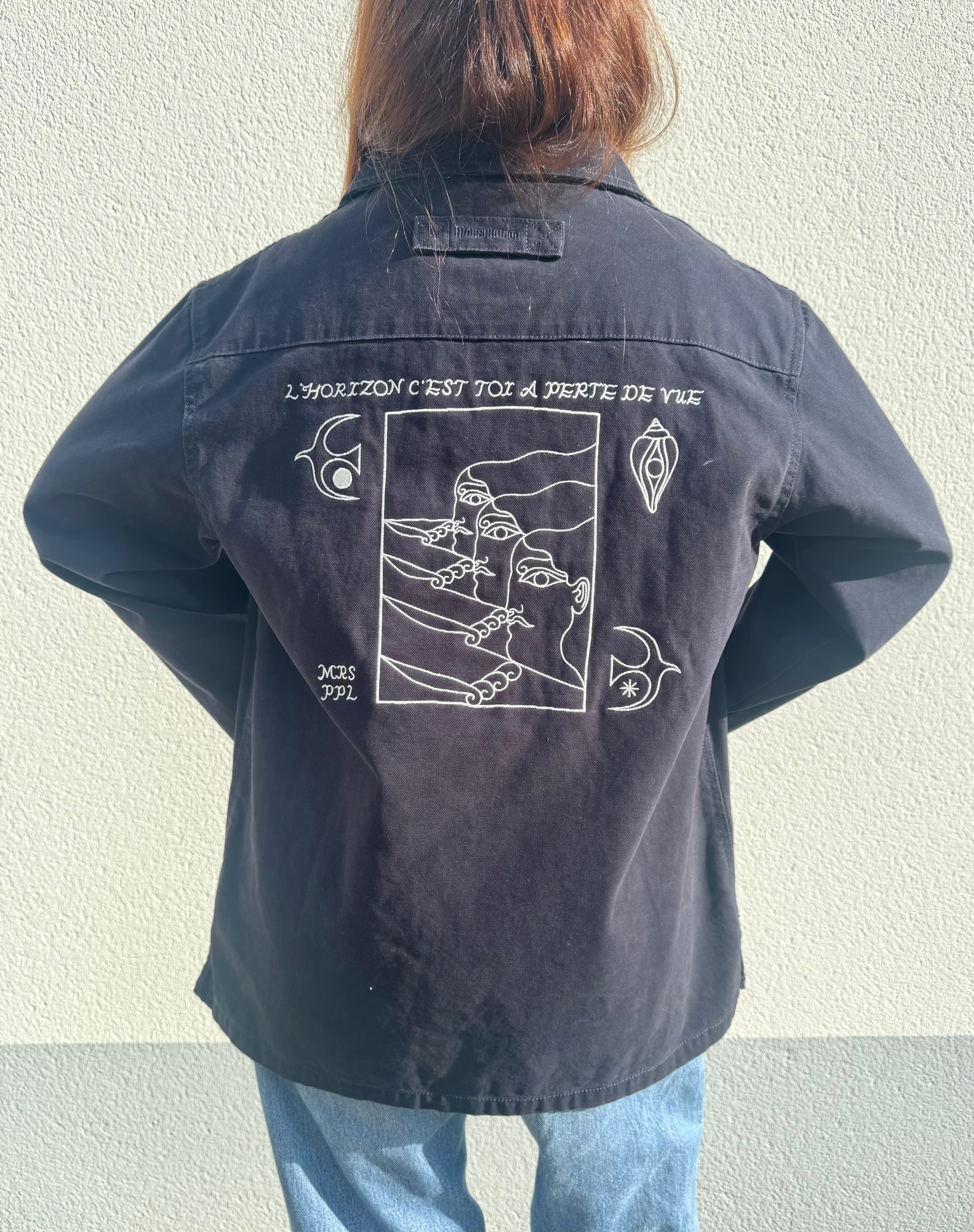 Cette pièce unique a été choisie pour illustrer l'univers artistique de Dothy. Utilisant la vareuse mousqueton comme support, elle transforme ce vêtement chargé d'histoire en une véritable toile d'expression